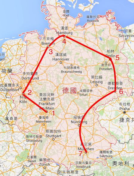 法蘭克福 – 科隆 – 不來梅 – 漢堡 – 柏林 – 德勒斯登 – 慕尼黑