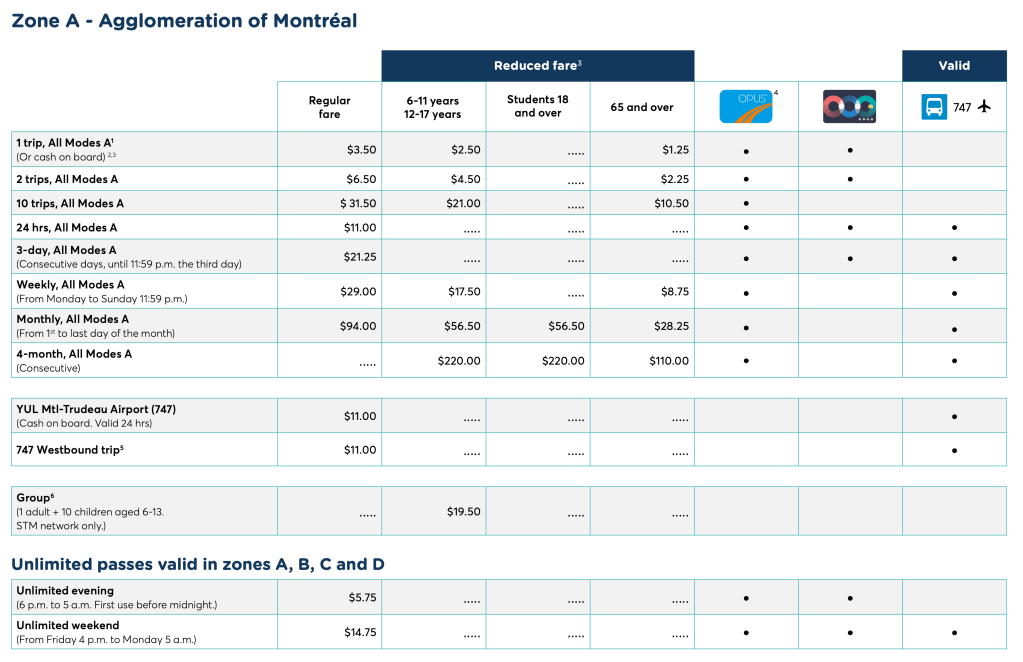 蒙特婁當地的交通票卡為OPUS Card,空卡需CAD$6,卡中可以儲2趟或10趟的搭乘額度,若最後不再繼續使用票卡,也可至各地鐵站服務櫃檯辦理退卡,另外也有販售24小時或3日內可無限制搭乘的Day Pass。有關蒙特婁A區大眾運輸票價,可參閱下圖或參考蒙特婁交通局網站: