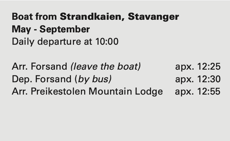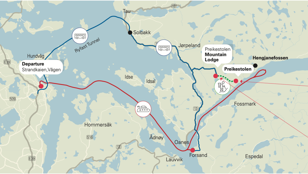 首先先從史塔萬格的彩色小屋前集合搭乘莉絲峽灣遊船,遊船會在莉絲峽灣繞行一周,若有參加健行行程的旅客,船會在Oanes作中途停留,再轉搭接駁巴士至聖壇岩登山口。而登完聖壇岩後,也會有接駁巴士在登山口等候,再行駛回史塔萬格市中心。