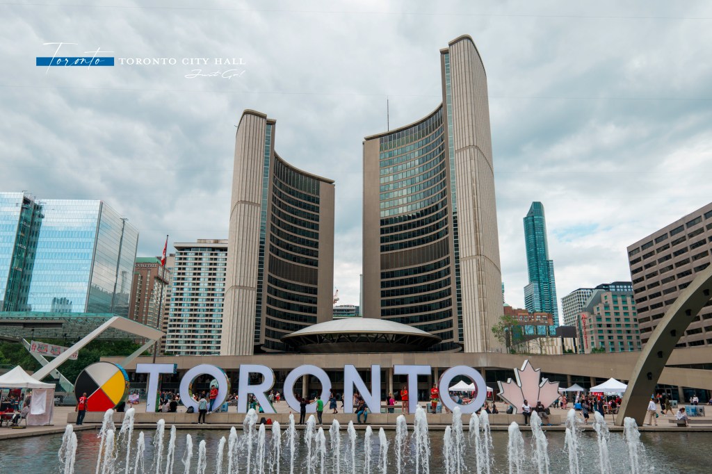 多倫多市政廳建造於1965年,是有兩座相對的半弧形大樓所組成。而大樓前方為彌敦菲臘廣場,提供市民平時在市中心有個休憩的活動空間。若是冬季時,彌敦菲臘廣場更是會變成大型的滑冰場。廣場上大型TORONTO字樣,是許多來到多倫多的遊客必拍照打卡的景點。