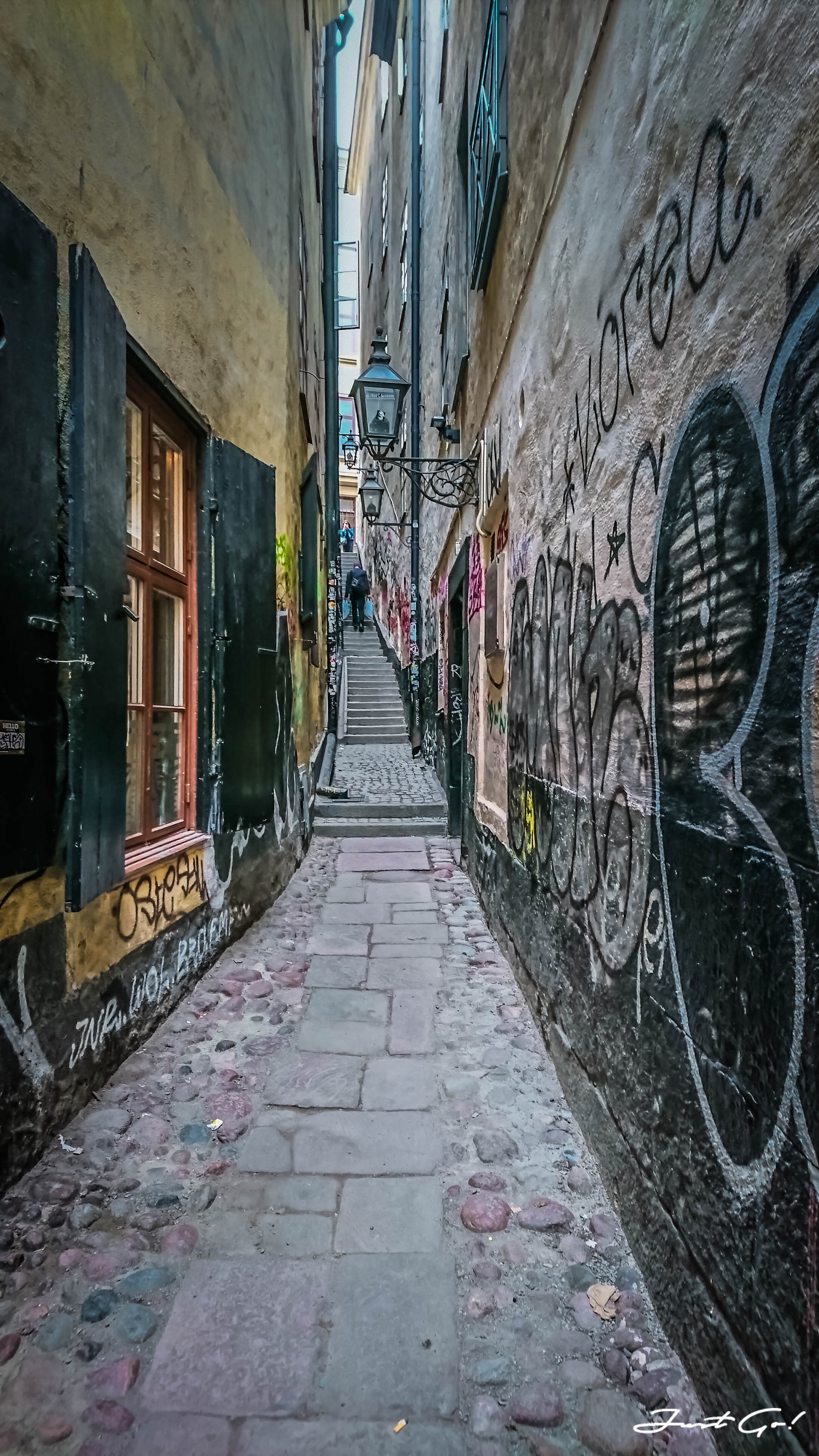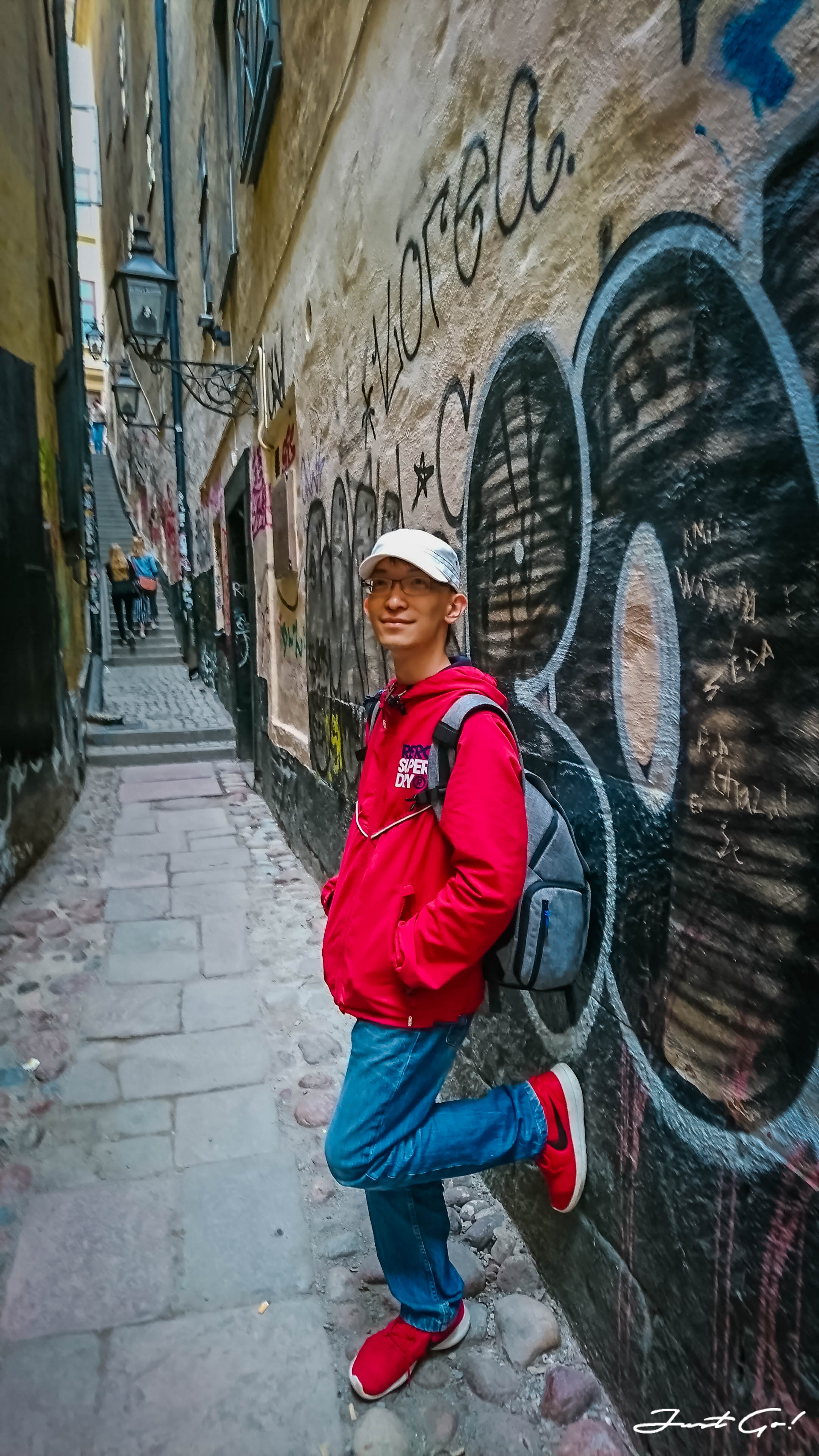最後,我們經過了Mårten Trotzigsgränd街,這條街道是整個舊城區裡最狹窄的一條街,寬度只有90公分,不過還是比我們台灣鹿港摸乳巷要寬的許多啦!街道的牆上現在畫滿街頭塗鴉,在古色古香的舊城區內反而覺得有種衝突的現代美感。