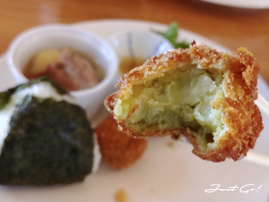 定食:一口可樂餅、滑茸、荏胡麻業做的泡菜、燉煮馬鈴薯&豬肉、山菜