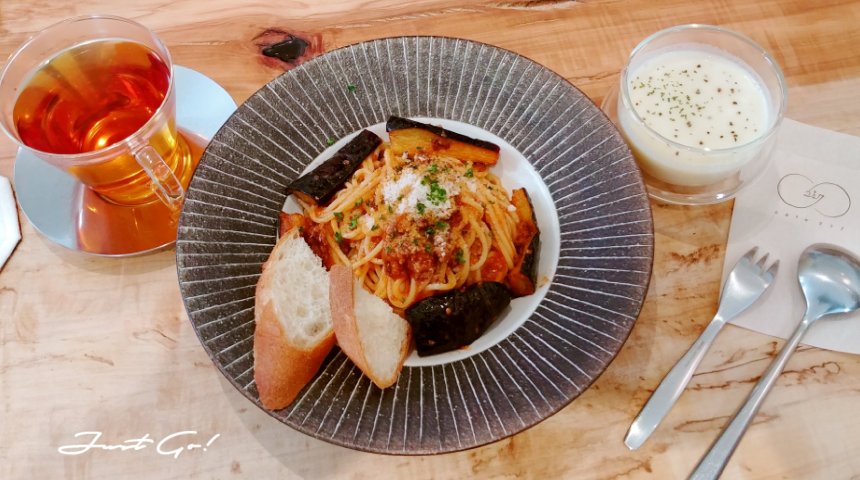 主餐pasta則是中規中矩又注重擺飾,燉茄子與麵包讓義大利麵外觀不那麼死板,搭配上濃湯讓畫面更加漂亮,最後的飯後甜點與紅茶飲品,為這頓午餐作一個精彩的收尾,份量非常適中,男生吃完不會覺得肚子還空空的。