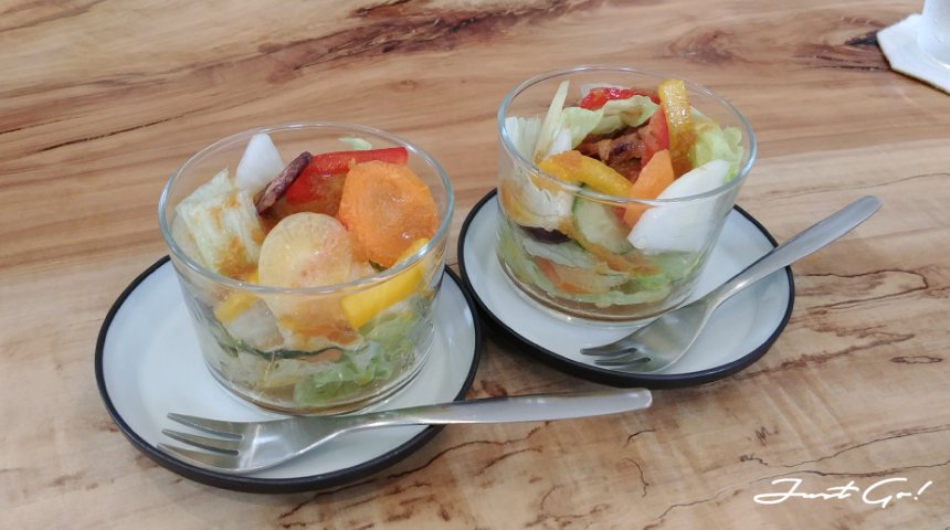 パスタ,其實就是pasta,這間餐廳屬於義式餐廳,但又有日本精緻的特色,前菜沙拉就有巧思的擺飾,用高麗菜作為隔層或底層,將紅蘿蔔、青椒與其他叫不出名字的蔬果顏色襯托出來。