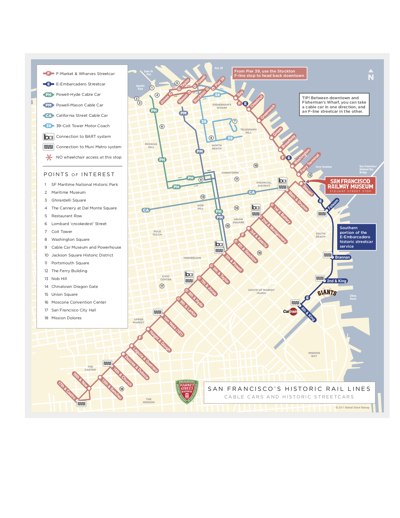 BART在舊金山市區一共有四站,Civic Center/Union Plaza、Powell St、Montgomery St和Embarcadero。如果住的旅館距離車站較遠的話,還是建議到市區後再轉乘公車,不過記得要跟站務員領轉乘券,就可以免費搭乘(需要在1.5-3小時內再次轉乘才會免費)。