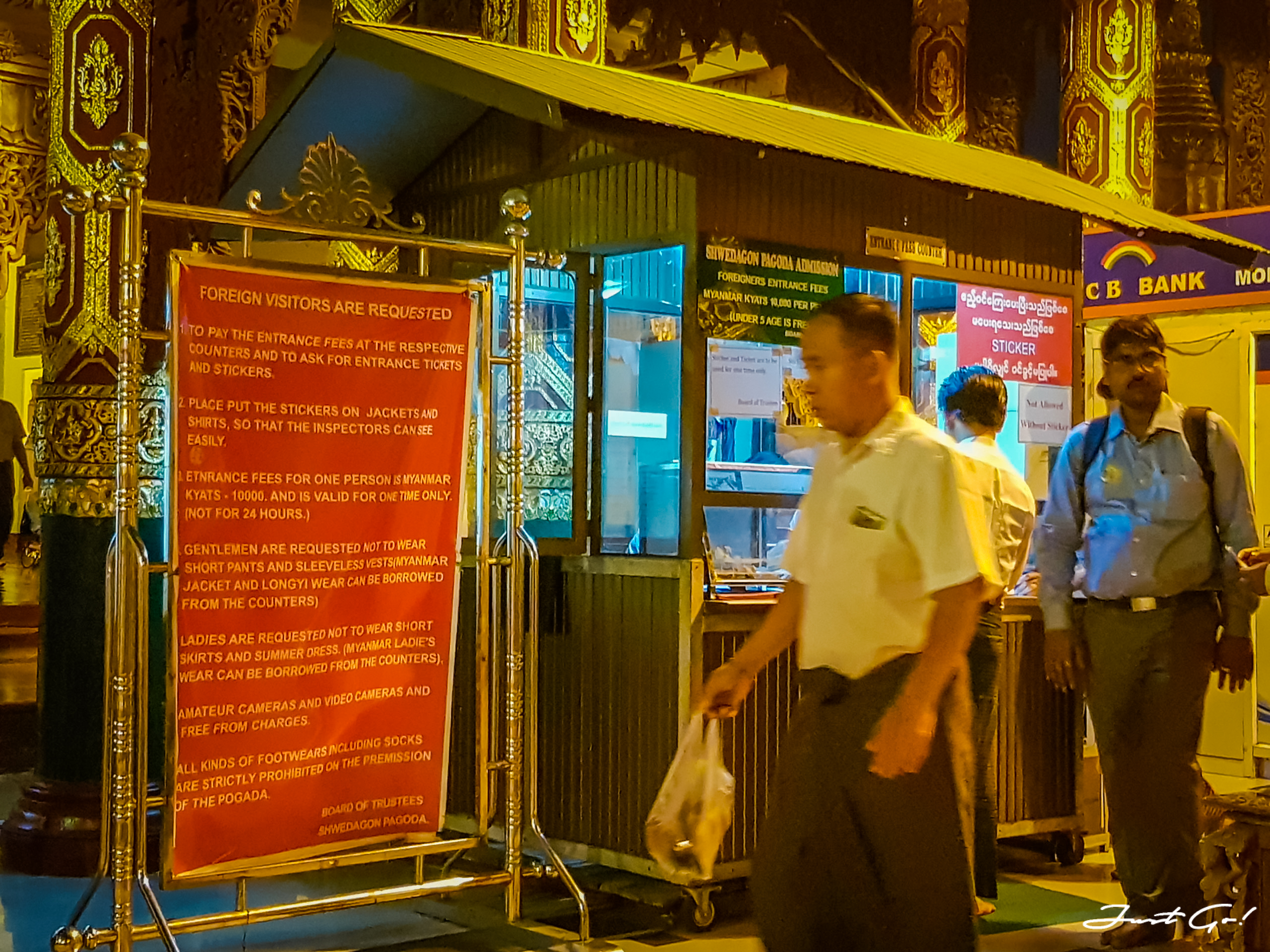 爬上階梯最頂端,就是大金塔的入口。目前外國人如果要進入參觀大金塔,必須付10000Kyats的入場費,付費完會拿到一個貼紙,必須將貼紙貼在身上證明已付過入場費用。另外售票亭也有提供聘請英文導覽員的服務,可以請當地導遊介紹大金塔。