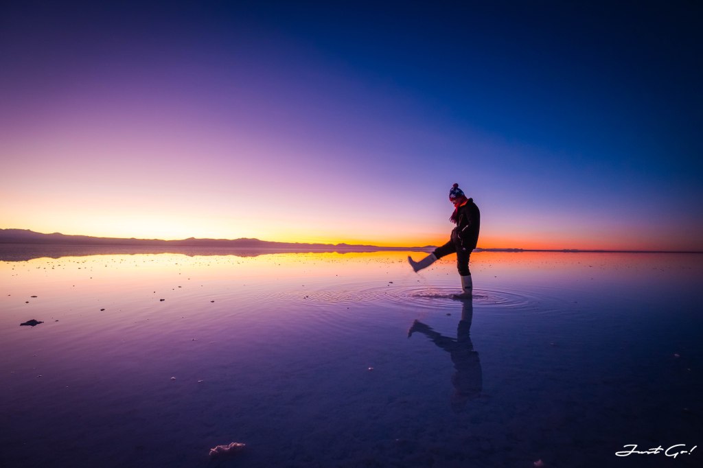 下午4點出發前往有水的鹽湖觀賞日落,並且等到日落過後繼續停留等待欣賞烏尤尼夜晚的星空,並在鹽湖中拍攝星空照片。