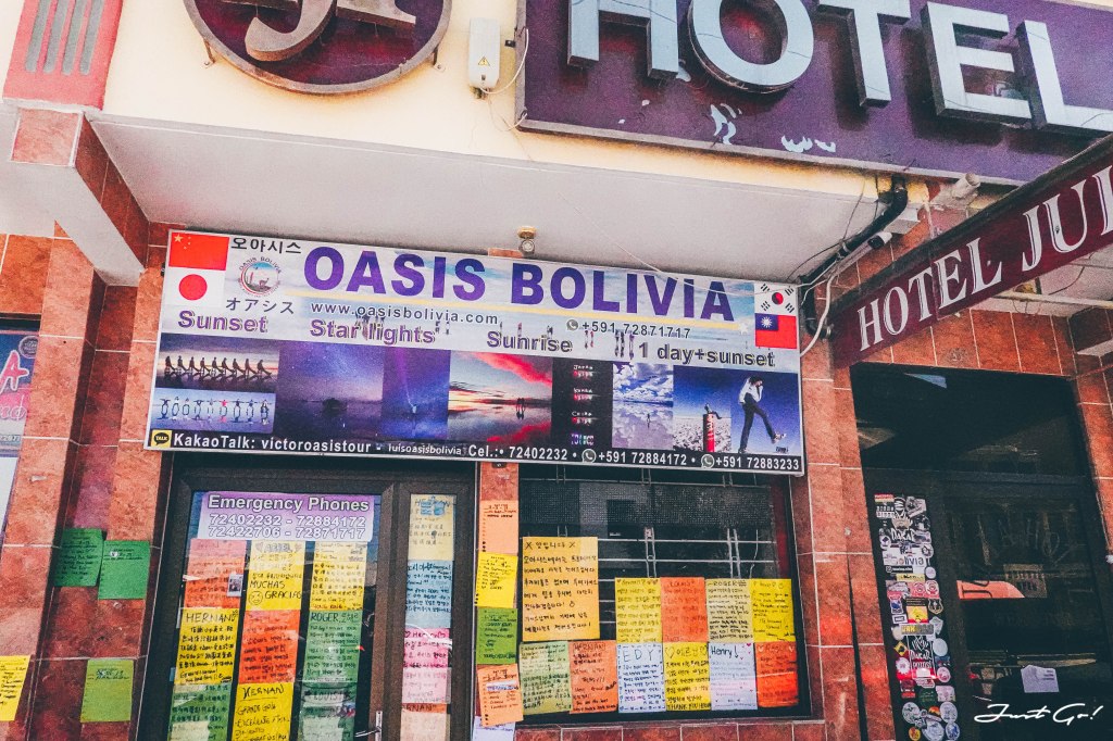 這次我們在烏尤尼一共待了三天時間,第一天先是找好了這三天的旅行社Tour,也在傍晚參加了Hokada Mountain的日落團+星空團行程。隔天早上10點半我們準備出發參加在烏尤尼的第二個行程:烏尤尼鹽湖一日團和日落團,而這次我們選擇了Oasis這間旅行社。下面將會分享一下,我們參加Oasis一日團+日落團的心得。