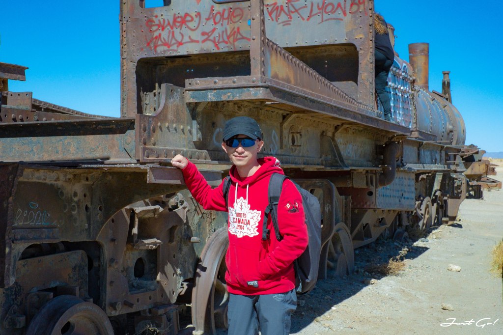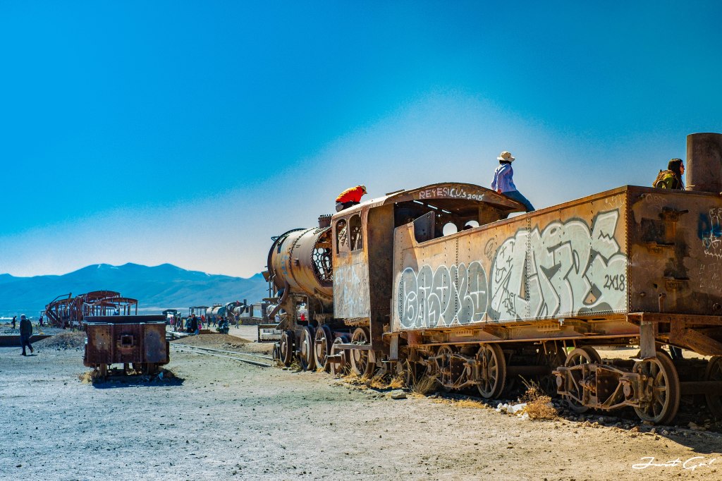 一日團的第一站,先是來到了距離烏尤尼鎮中心3公里的火車墳場。這邊一堆廢棄火車的由來要回朔至1892年,當時烏尤尼開通了主要為採礦業服務的鐵路,不過1940年代後因礦業轉趨式微,許多老舊的火車頭和車廂被棄置於此地,故有火車墳場的稱號。