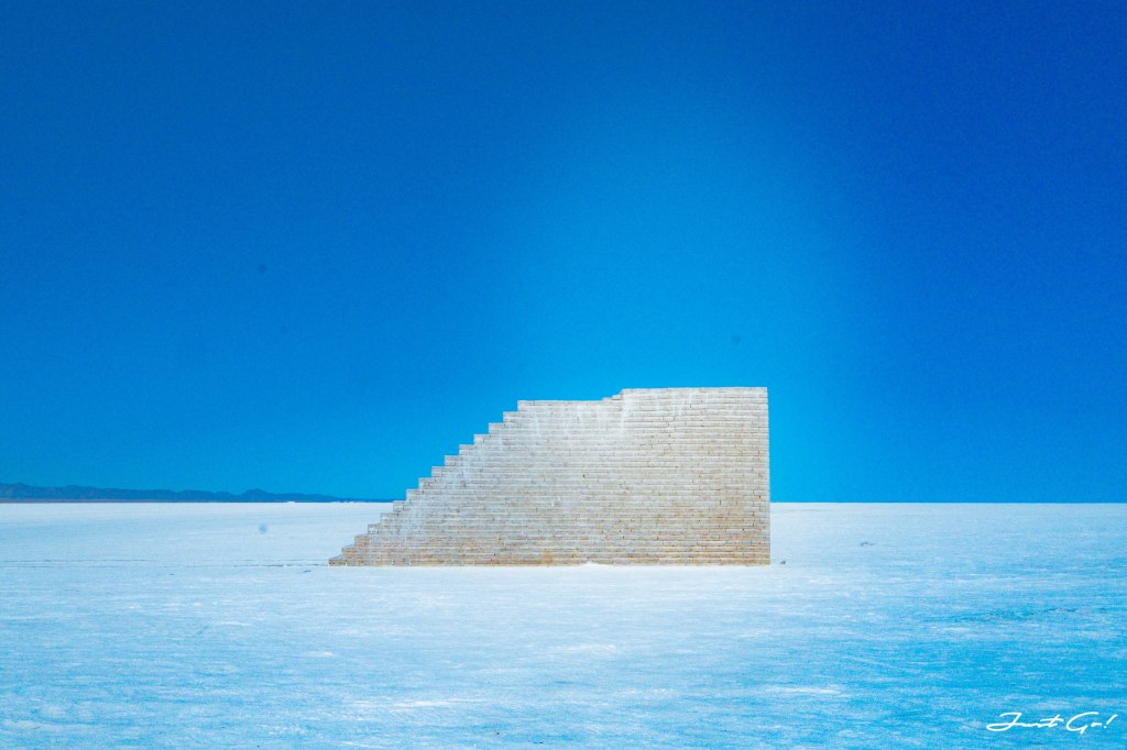 短暫停留了Colchani小鎮,我們的司機載著我們進入了一望無際潔白的鹽沼中,從遠方漸漸看到一座石造的階梯就這樣突兀的坐落在潔白的鹽地中。