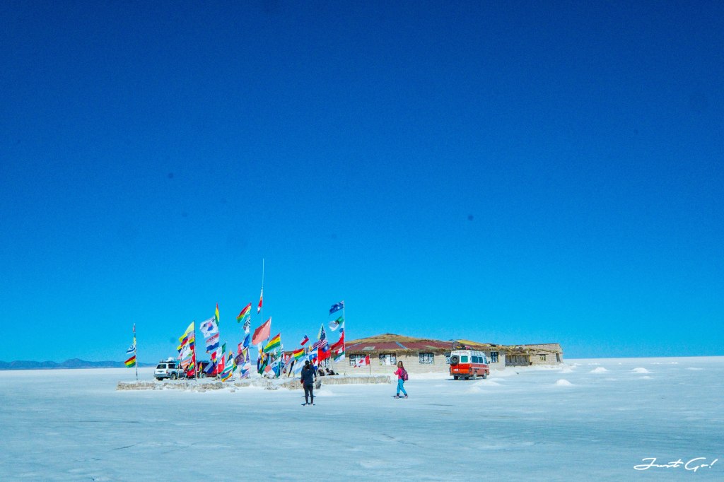 在用完餐後,司機再次的載著我們來到了所有烏尤尼一日團必訪的景點—鹽紀念碑(Monumento Rally Dakar)。而鹽紀念碑旁就是另外兩個一日團著名景點:萬國旗和鹽旅館。所以司機先讓我們在鹽紀念碑旁下車,之後再步行至萬國旗和鹽旅館。