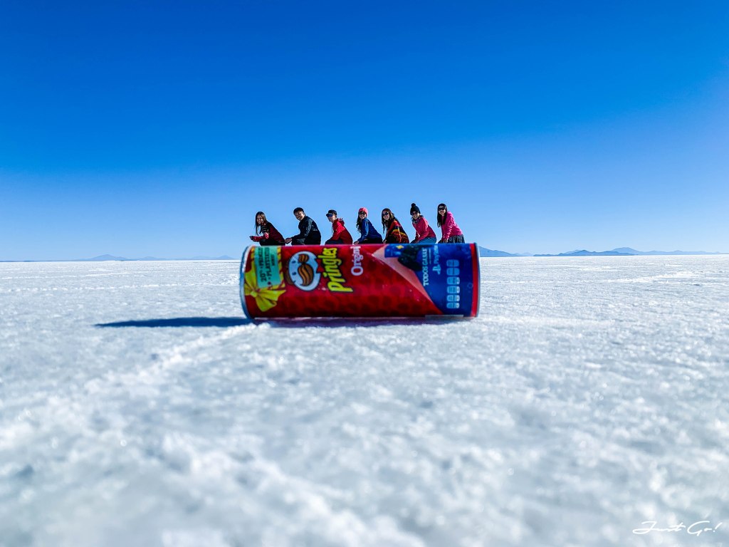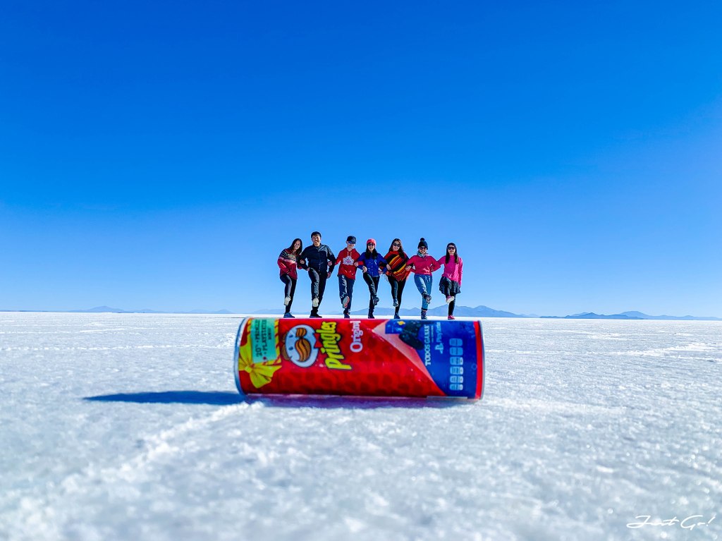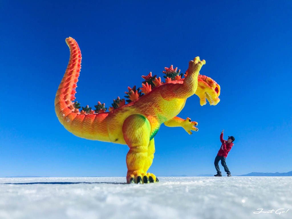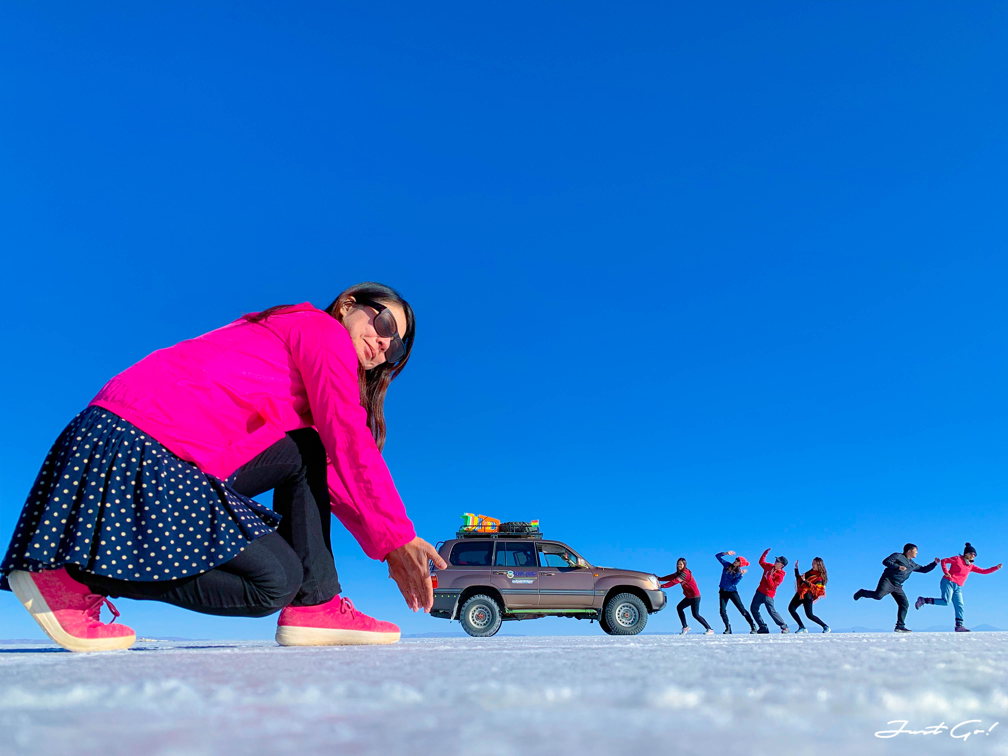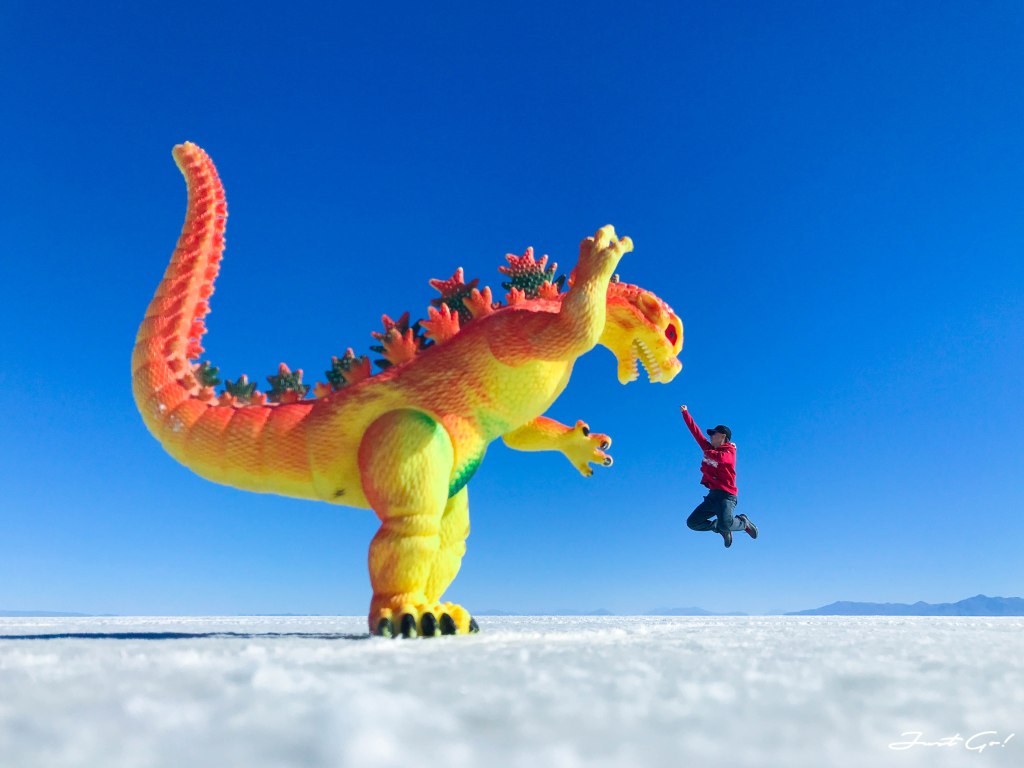 再次的又來到了一片一望無際潔白的鹽地,這時司機開時從車上拿出哥吉拉模型、品客罐等等道具,一邊指導我們擺Pose,一邊幫我們拍出一張張獨特又有趣的借位照片。