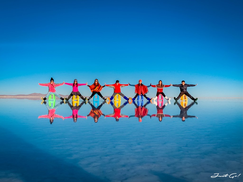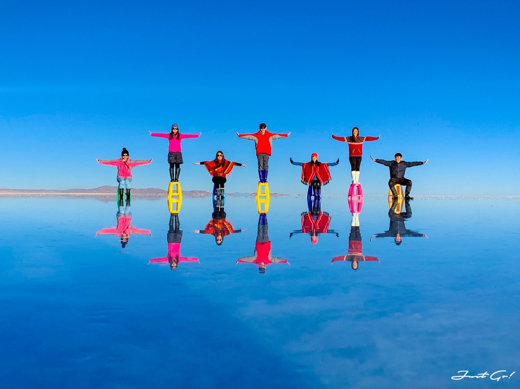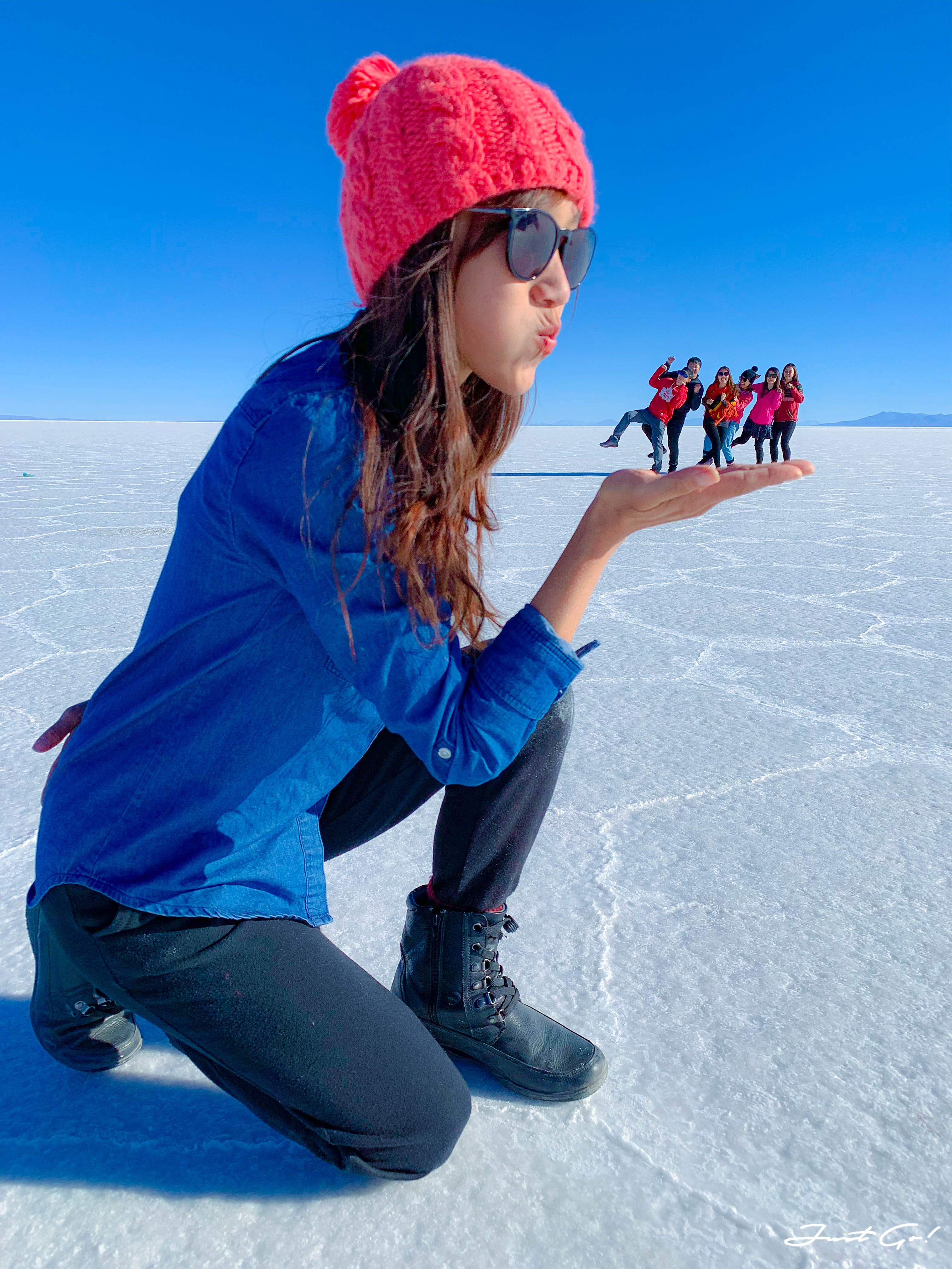 與昨天同樣的場景,司機再次從車上拿出板凳,但這次終於不是像昨天一樣玩大團康遊戲般併團一起拍了。而我們的司機同樣指導了我們拍了幾張烏尤尼天空之鏡的標準Pose照,再看過剛剛鹽沼上令我們驚豔不已的借位照之後,現在我們超信任我們司機的攝影技術了。