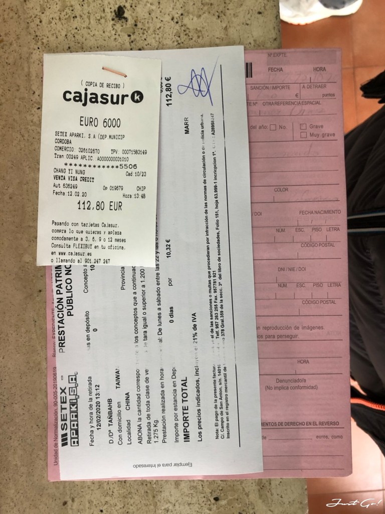 這次我在哥多華(Cordoba)就不小心停到殘障車位的車格,結果車子就被拖吊了。在路旁就貼了一張拖吊通知單,最後拿著通知單搭上計程車前往拖吊場領車,被罰了€112.8,頓時心在淌血,都可以停好幾天的付費停車場了。