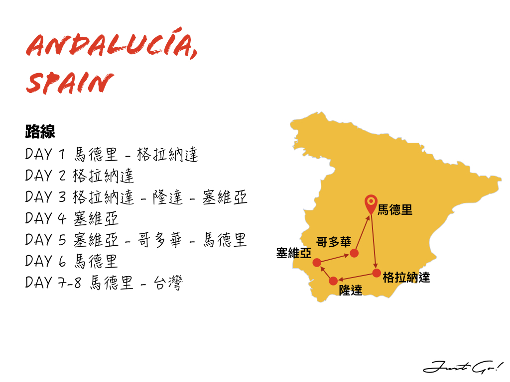 這次在安達魯西亞的自駕行程,從馬德里出發僅有短短一週的時間,所以能夠造訪的城市其實很有限,除了必去的格拉納達、塞維亞和哥多華三個城市,還額外造訪了隆達這個懸崖城市,所以一共去了四個城市。