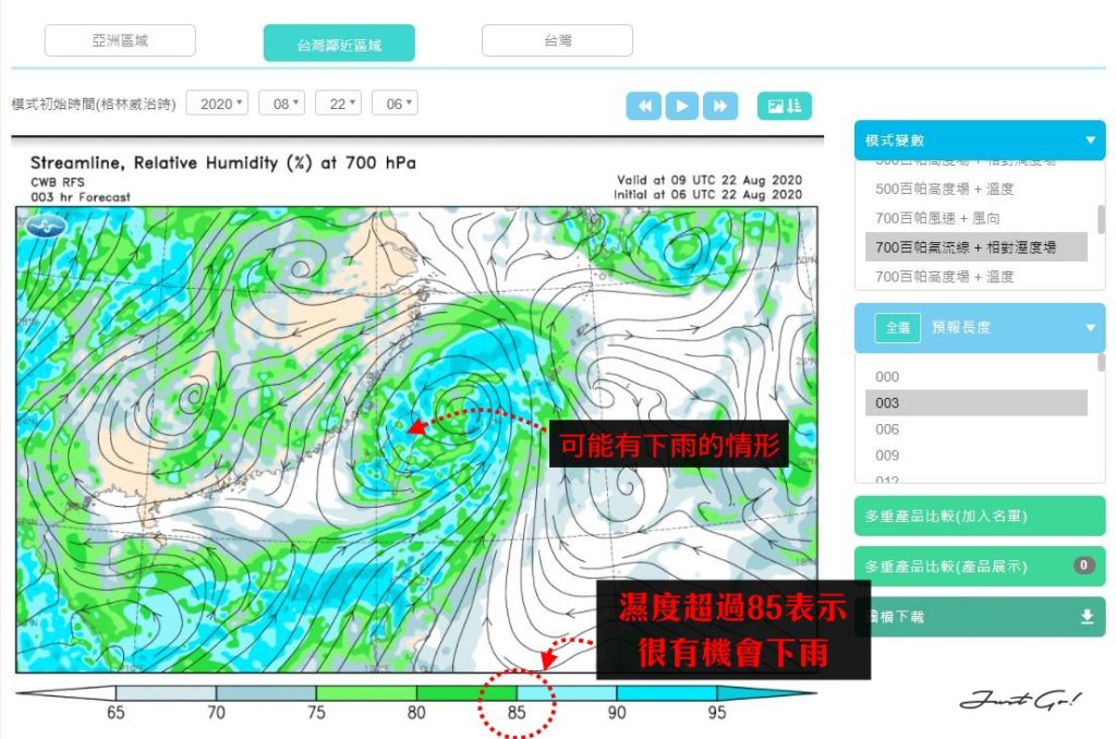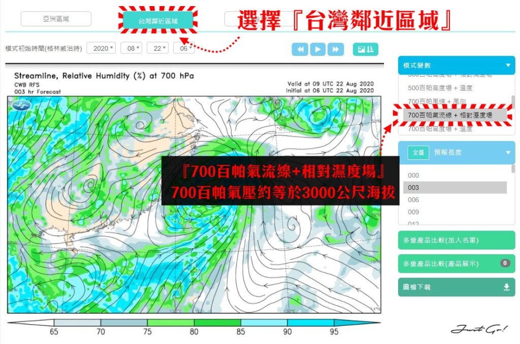 另外,也可以選擇『700百帕氣流線+相對濕度場』模式,由於700百帕的大氣壓力約等於海拔3000公尺左右的高度,所以選擇這個模式可以得知百岳海拔3000公尺左右相關濕度,也就是下雨的情形。