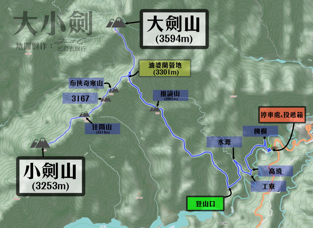 大小劍全程3天2夜來回約43.4公里,沿途有美輪美奐的油婆蘭營地、大劍山風景跟累到不行的小劍山,個人認為是「一生一次」的行程,沒有試過,就永遠不知道這句話的含意XD;本篇文章前半部提供3天行程概要、GPX、登山口、申請方式、水源、高度圖、相關費用、裝備一覽等參考資訊,後半部分則是提供爬山遊記,包含我的空拍機不幸終結在山谷的過程QQ。