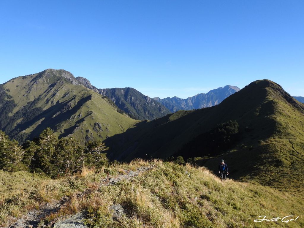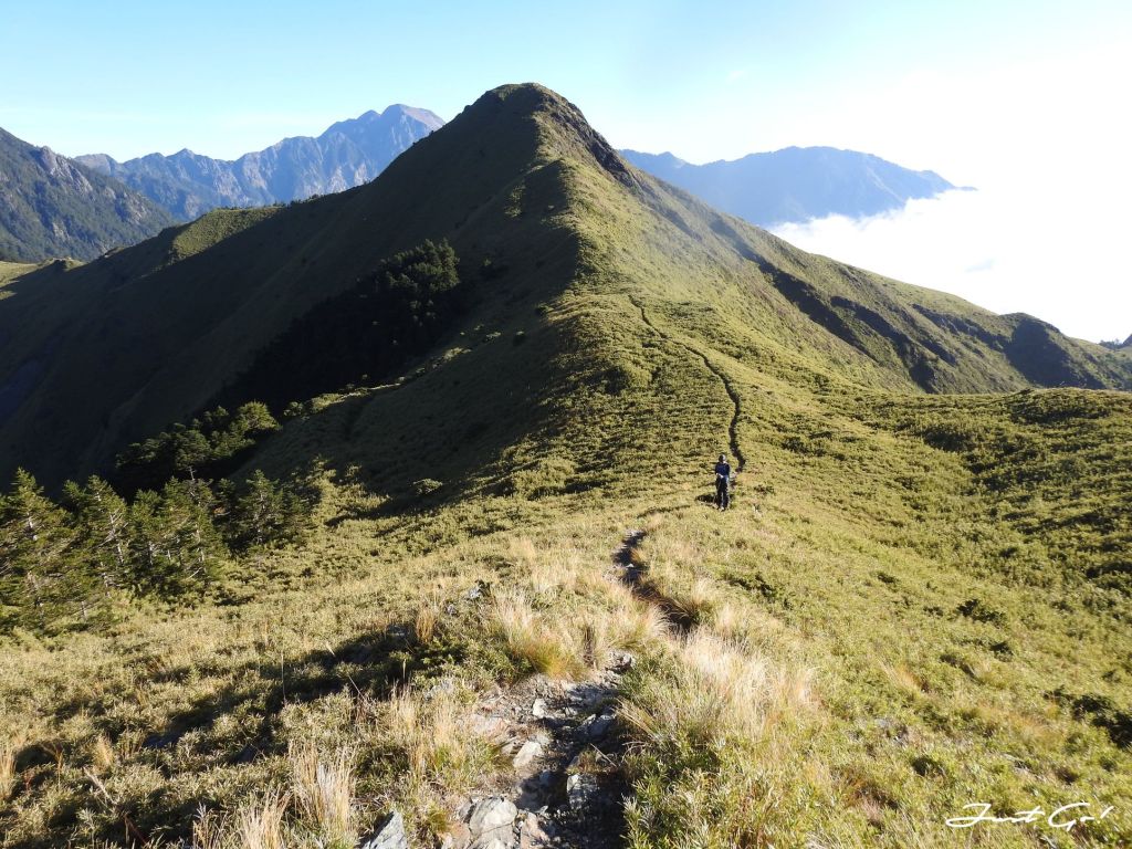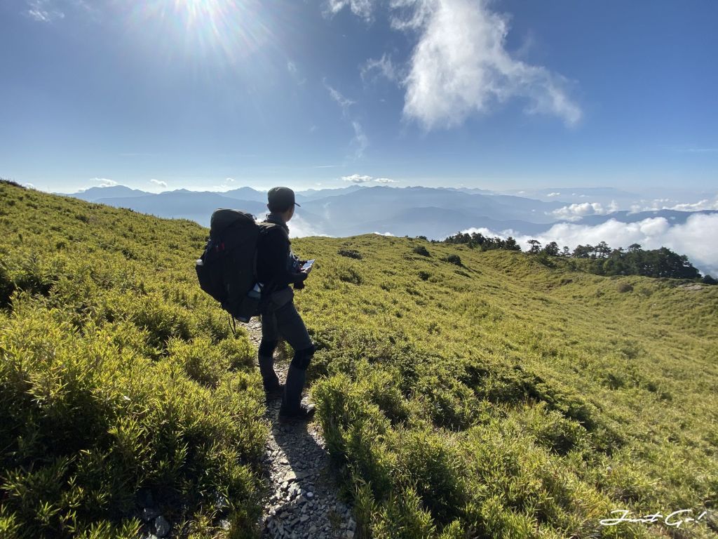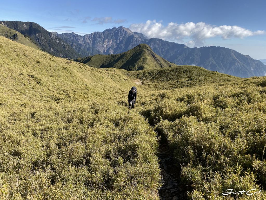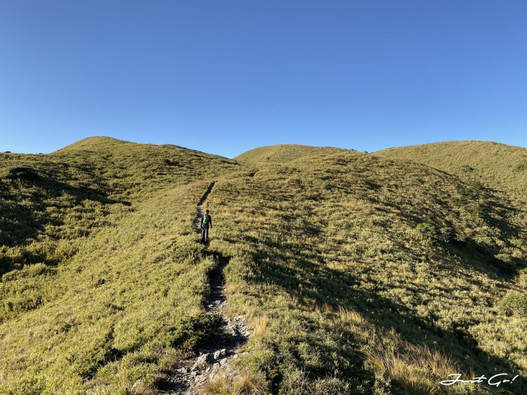 距前一晚居住的油婆蘭營地大約3.1公里,回想整個過程,先是悠閒地下降100公尺,再爬升300公尺,看到有如合歡山系列的草原與坡度,走在這裡的舒適程度,完全不符大小劍行程(天梯、佳陽山及劍山)的不人道風格