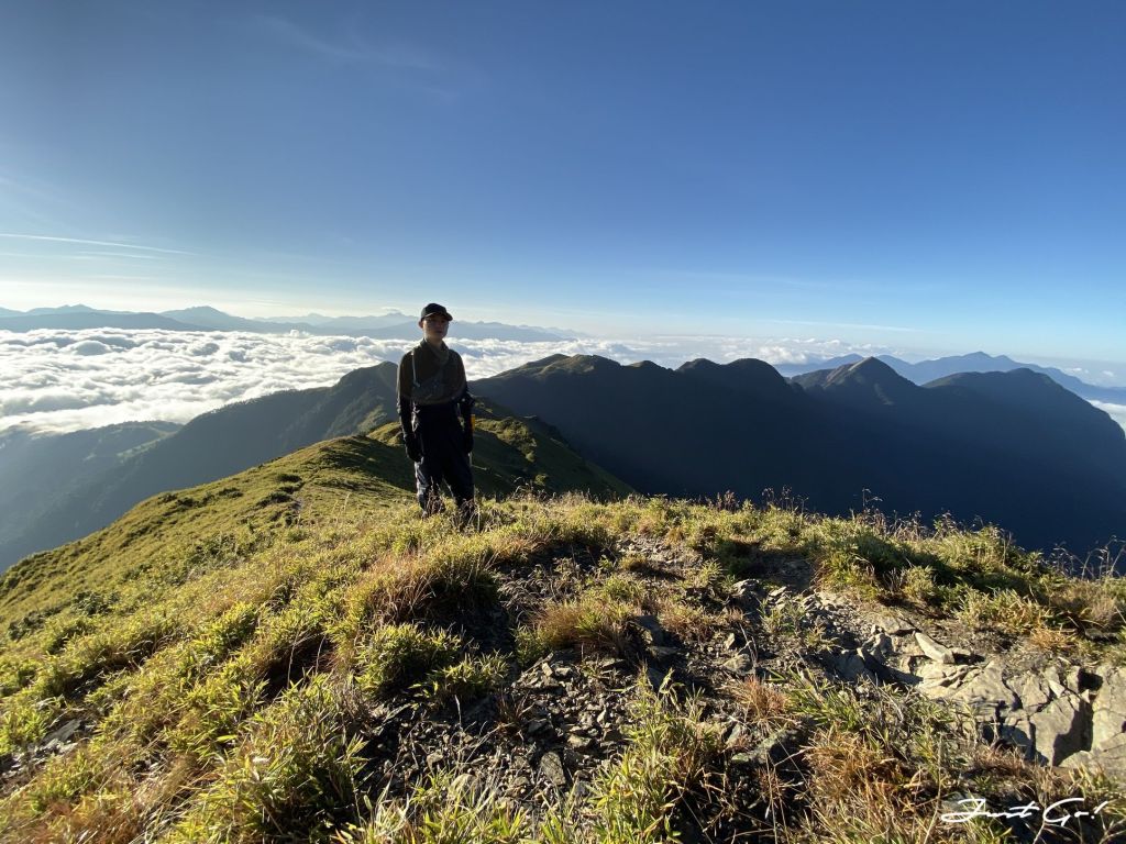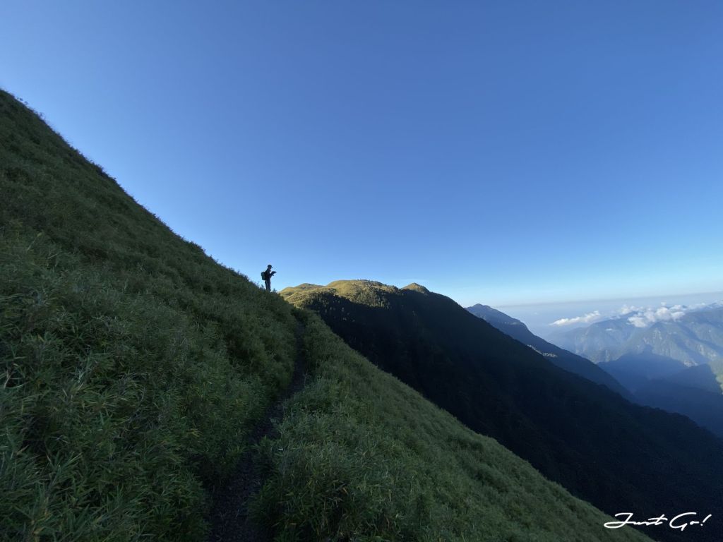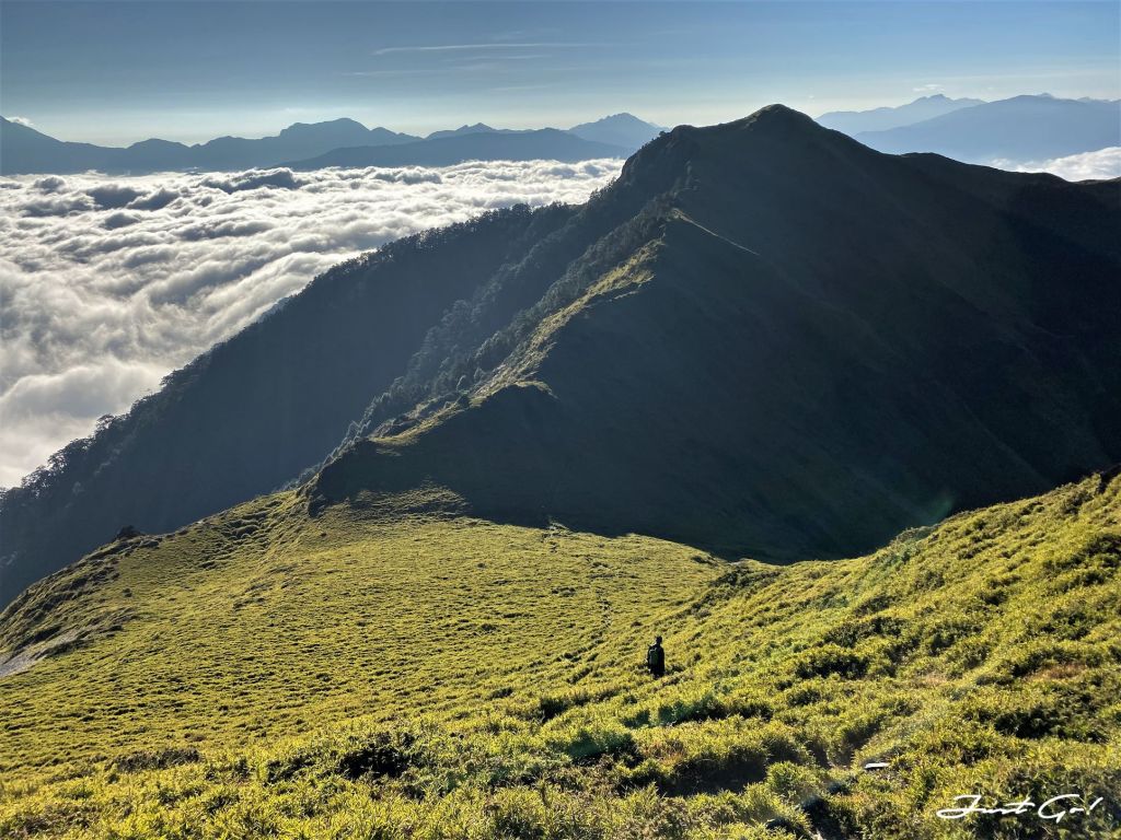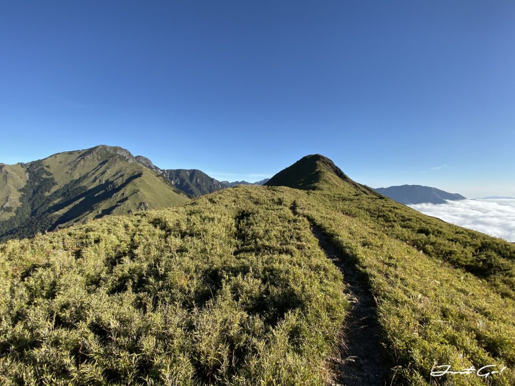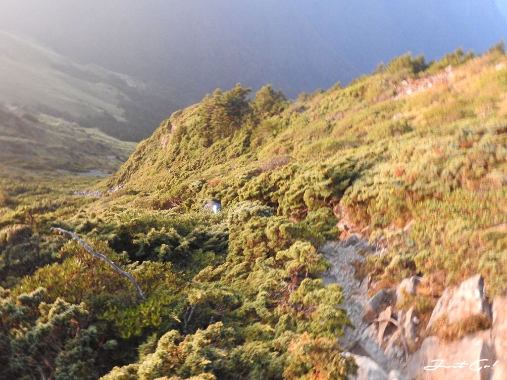 距前一晚居住的油婆蘭營地大約3.1公里,回想整個過程,先是悠閒地下降100公尺,再爬升300公尺,看到有如合歡山系列的草原與坡度,走在這裡的舒適程度,完全不符大小劍行程(天梯、佳陽山及劍山)的不人道風格