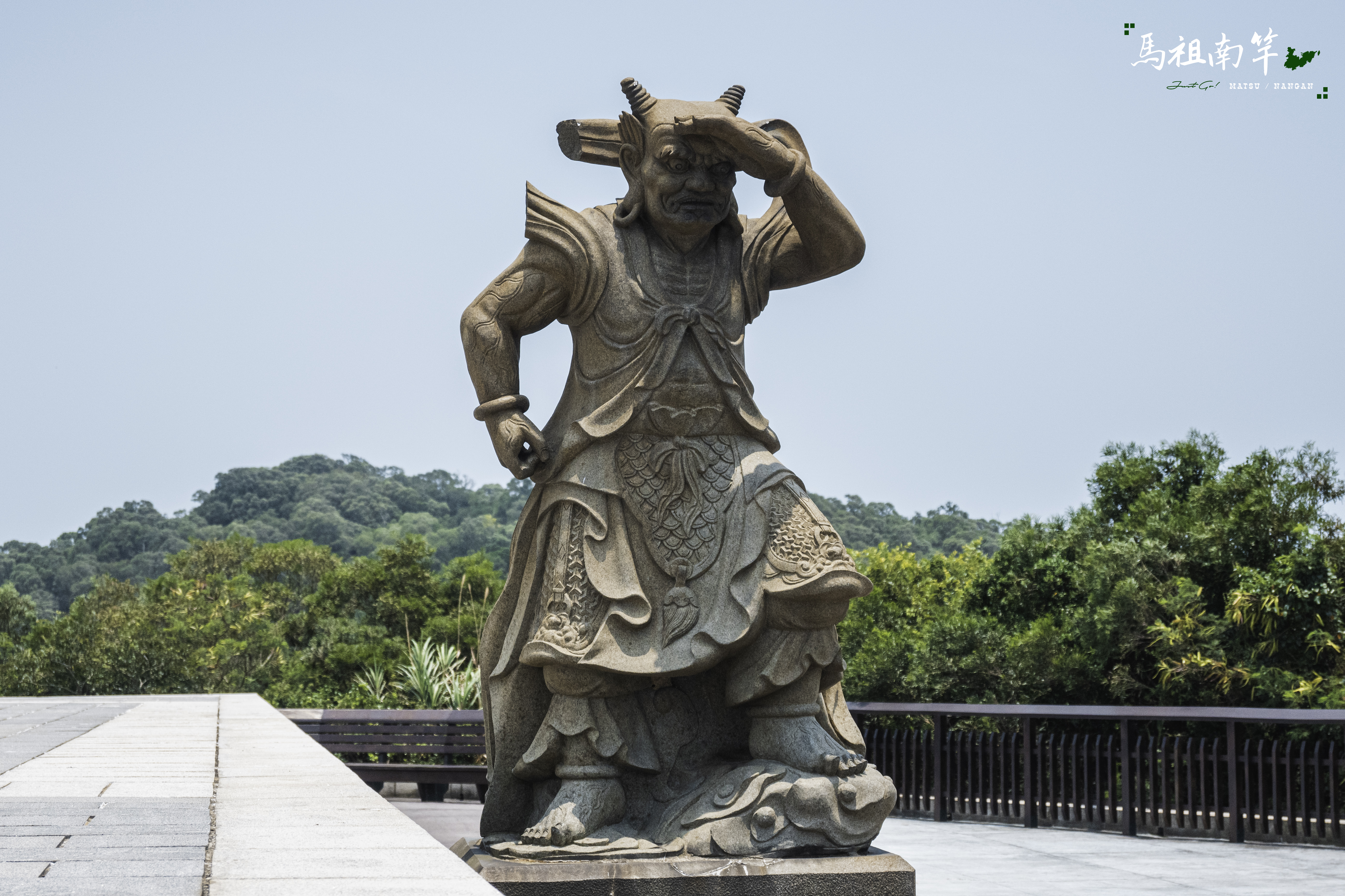 媽祖像的兩側還有千里眼與順風耳兩尊媽祖部將的雕像,媽祖前的瞭望台遠觀似艘船,能眺望南竿島遠方的風景。若從遠處望向媽祖巨神像,就像媽祖乘著船在海上航行,庇佑著當地居民。