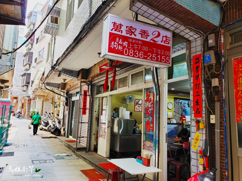 萬家香以販售馬祖獨特的「狗麵」聞名,所謂的「狗麵」是來自馬祖當地福州話音譯而來。早期馬祖人自製麵食時,會用木棍或酒瓶來擀麵,叫作「拍棍麵」,因此狗麵的原意應為「棍麵」或「槓麵」。