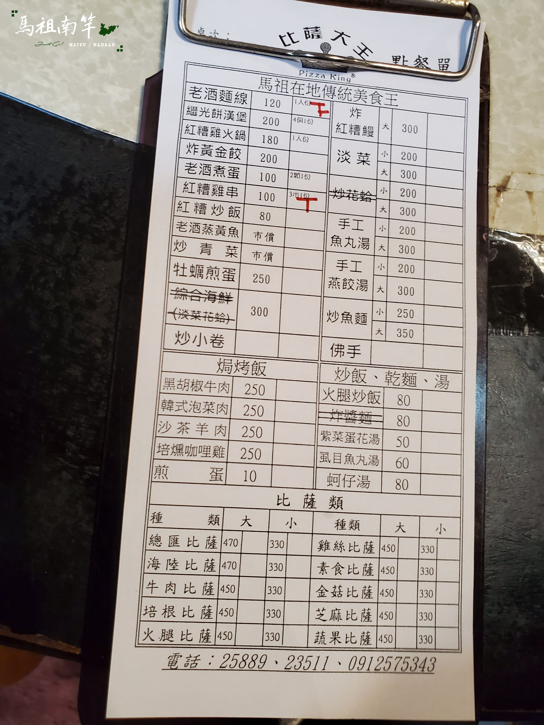 一聽到餐廳名稱,很多人會認為這間店最有名的招牌就是「披薩」了,雖然店內的確有販售披薩,但這裡的「老酒麵線」可說是最符合台灣本島遊客的味蕾,口味上較為清淡一些,不會有過濃的酒味,湯頭會讓人想一口接著一口。除了老酒麵線外,比薩大王也有許多馬祖當地特色料理,如紅糟炸肉串、繼光餅漢堡等,也是可以多多品嚐的。