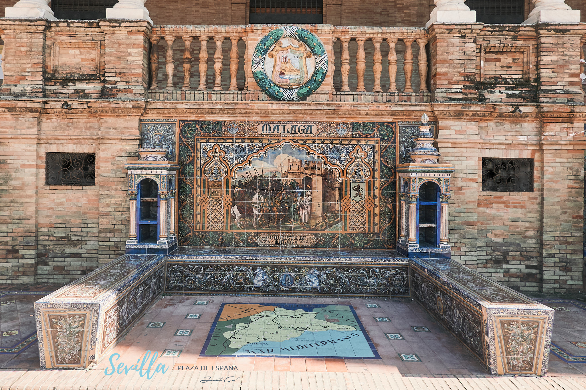另外在西班牙廣場建築底層則設有共58個長椅,長椅上磁磚描繪了西班牙共58個縣市的標誌、位置和該地的重要史跡,經過時可以特別留意一下。
