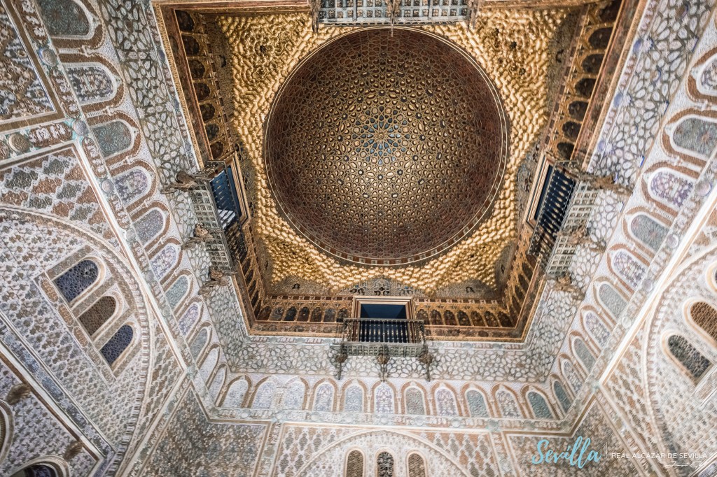 塞維亞王宮也有人稱為「阿卡乍堡」,是當時國王佩德羅一世請各地知名伊斯蘭工匠模仿格拉納達的阿爾罕布拉宮打造而成,王宮為典型穆德哈爾式建築風格。皇宮內「少女中庭」是整個王宮的朝政中心,一共分為上下兩層,四周有迴廊環繞,迴廊中則有多層式的拱門與細緻的壁雕。而1427年興建的「大使廳」則是王宮內最豪華精緻的大廳,屋頂上鑲金的木雕圓頂裝飾著星星狀的圖案,抬頭一看有如仰望滿天星空般的華麗,不禁讓我瞠目結舌、讚嘆不已。
