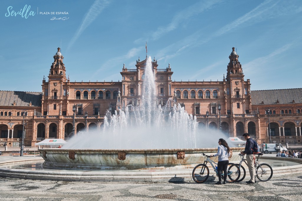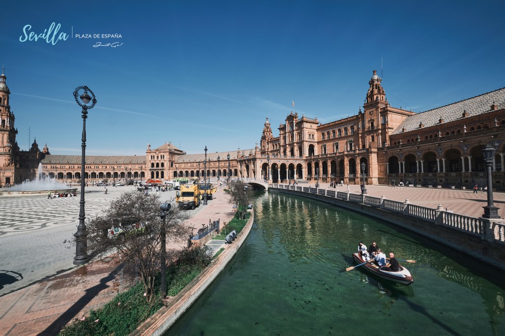 在廣場正中央為一座大型的噴水池,在噴水池後方的護城河,沿著後方建築劃出一道完美的弧形河道,更是這座廣場另一個特色,不時能看到遊客悠閒的在划船,享受西班牙南部的陽光。