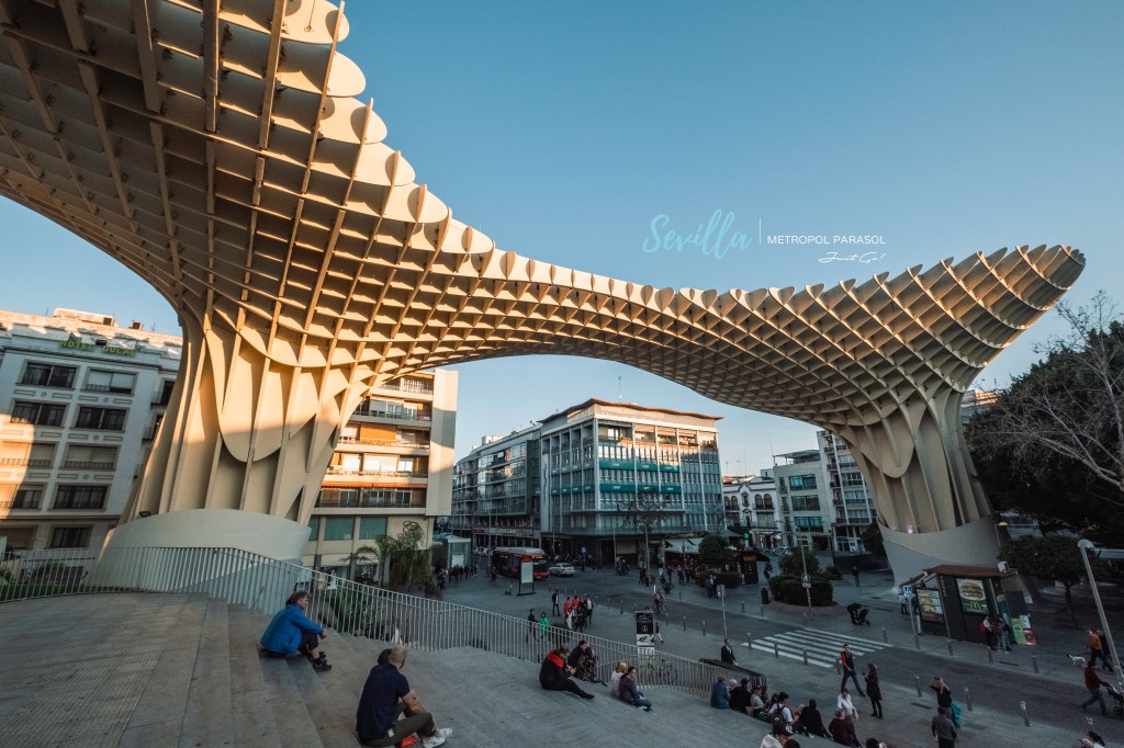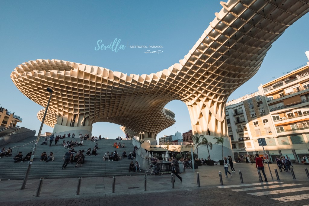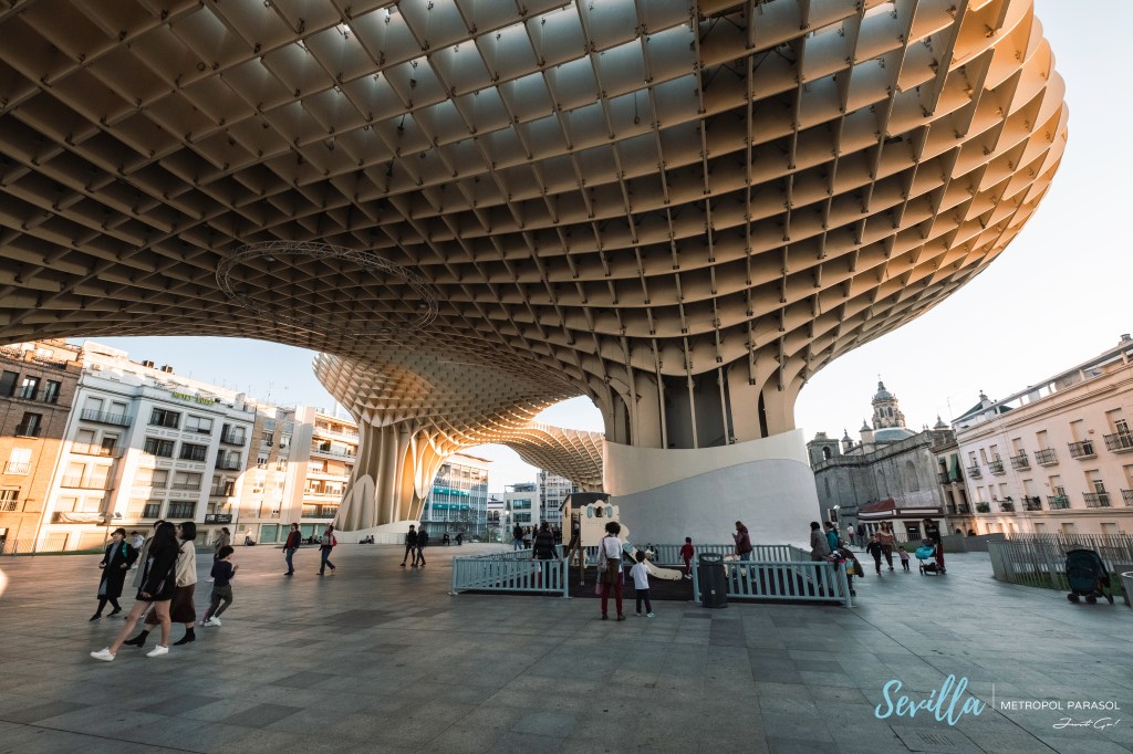 在塞維亞的最後一個景點來到了全世界最大的木造結構建築—都市陽傘,都市陽傘又被當地居民暱稱為「塞維亞大蘑菇」,是由德國建築師Jürgen Mayer H設計,整個建築體長150公尺、寬70公尺、高約26公尺,建築內一共分四層樓,地下室為博物館,主要展示過去開挖出土的羅馬及摩爾文物,一樓為中央市場,二樓及三樓則有觀景餐廳和觀景台,能夠從都市陽傘上方鳥瞰整個塞維亞市中心的景色。