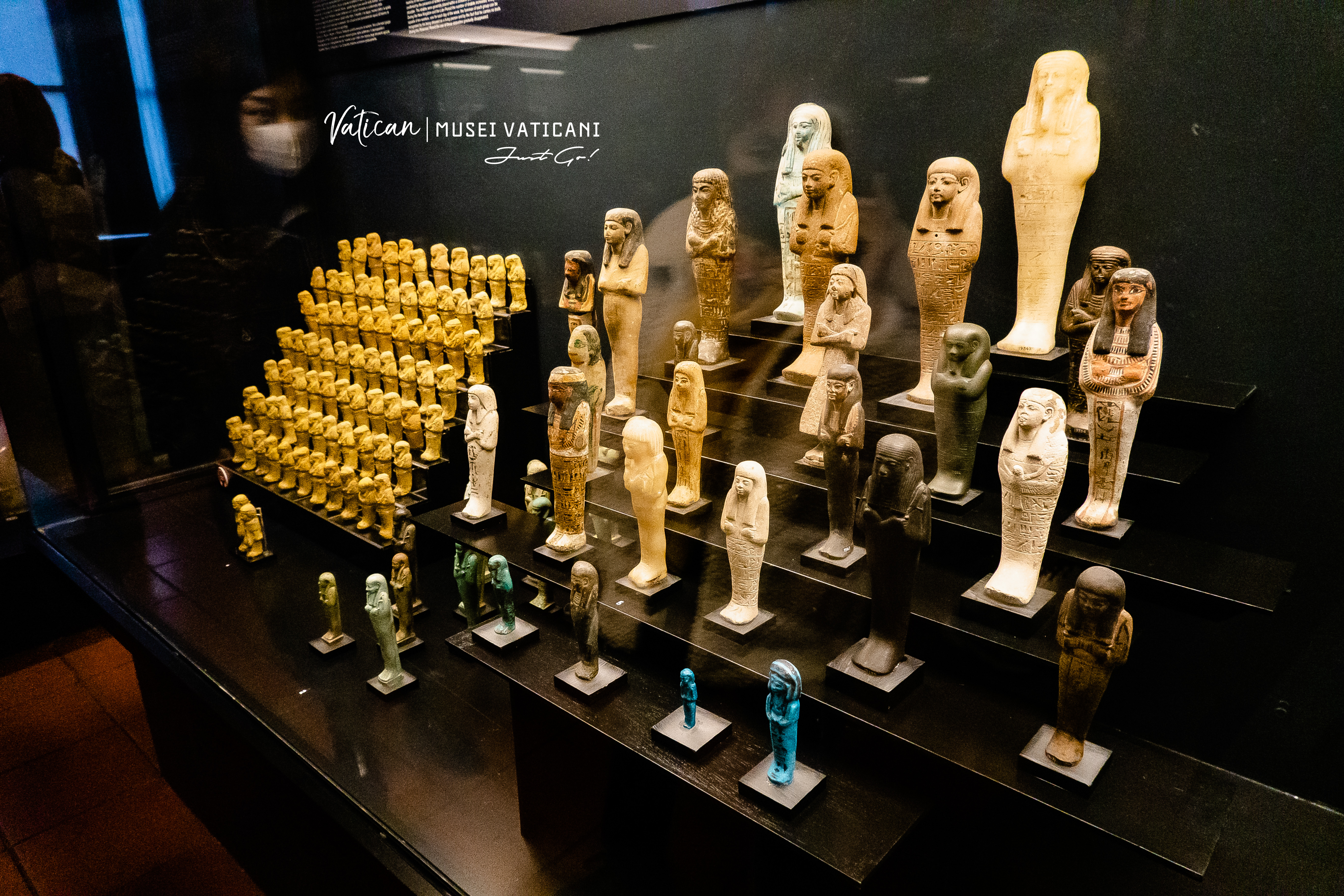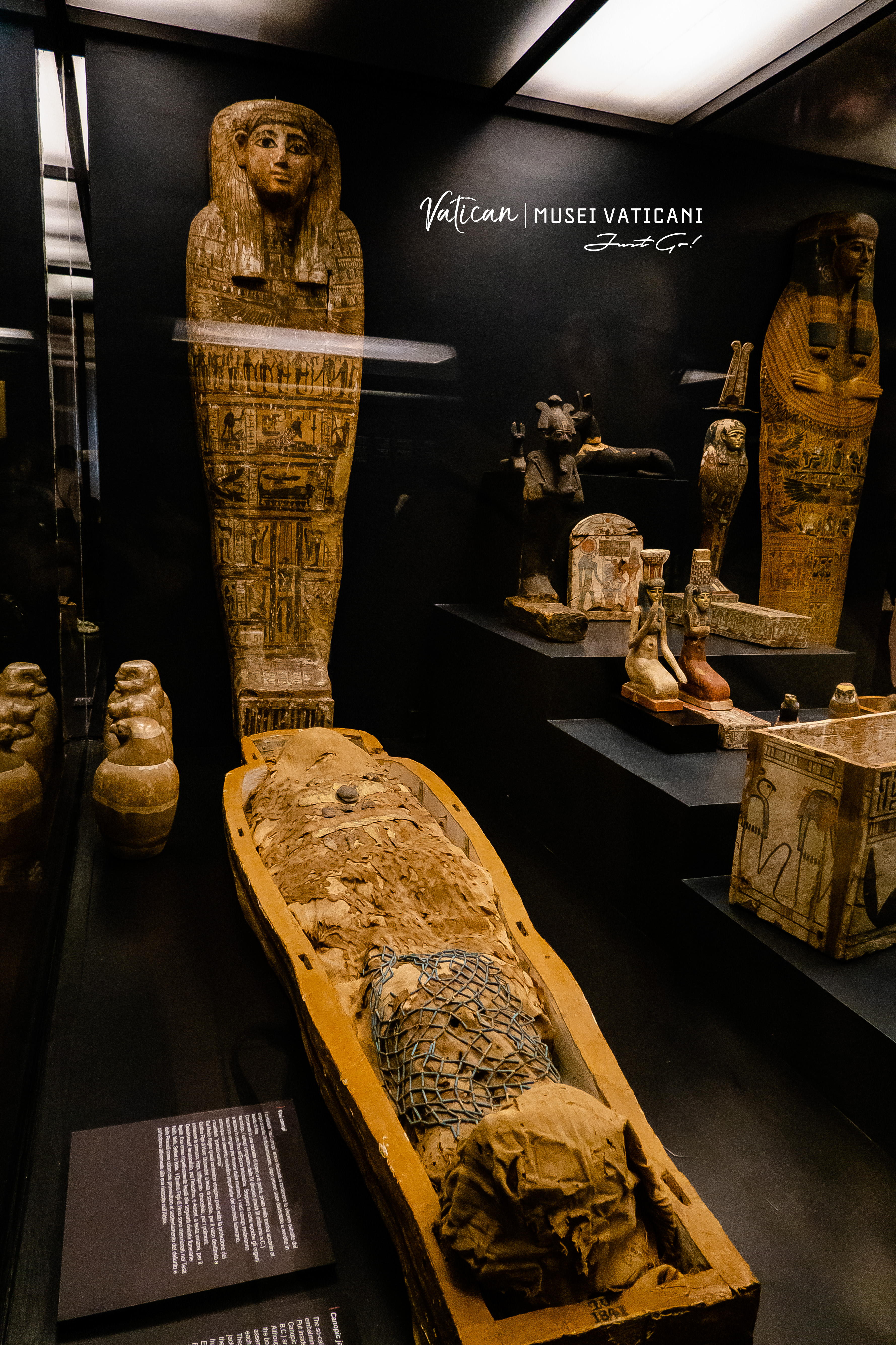 在世界各地眾多的博物館中,都能見到埃及古文明的文物,當然梵蒂岡博物館也不例外。在梵蒂岡的埃及博物館,裡頭的埃及文物主要是在帝國主義時期搬運而來,裡頭的展品包括最具代表性的石棺、木乃伊還有各式石像等,另外也有部分來自西亞美索不達米亞古亞述帝國的文物,一共有九間展廳。