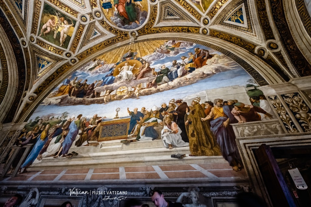 取名為「拉斐爾房間」的原因,在於這間廳房展示著由拉斐爾和其弟子親自繪製的精緻壁畫。房間內一共分成「君士坦丁廳」、「明暗對比室」、「赫利奧多羅斯室」、「簽署室」與「波哥的大火室」五間展廳,其中又以簽署室內的「雅典學院」、「聖禮的辯論」和「帕納蘇斯山」等最為著名。