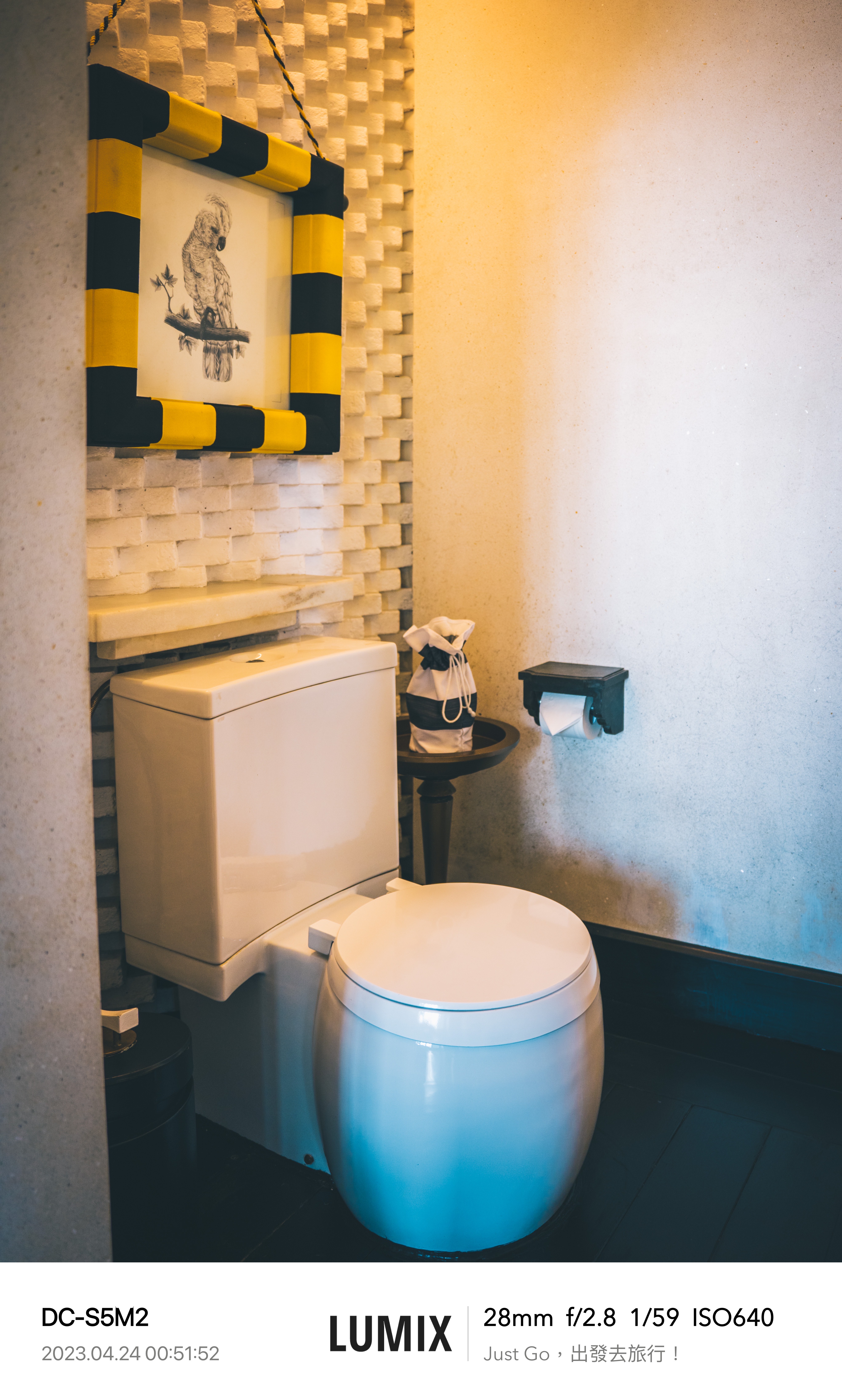 在浴廁的部分,大致可以分成三個空間,廁所、洗手台以及浴室。廁所馬桶是很特別的圓形造型,洗手台共設有兩個,洗手台上除了提供牙刷、牙膏等洗漱品之外,還有提供吹風機。