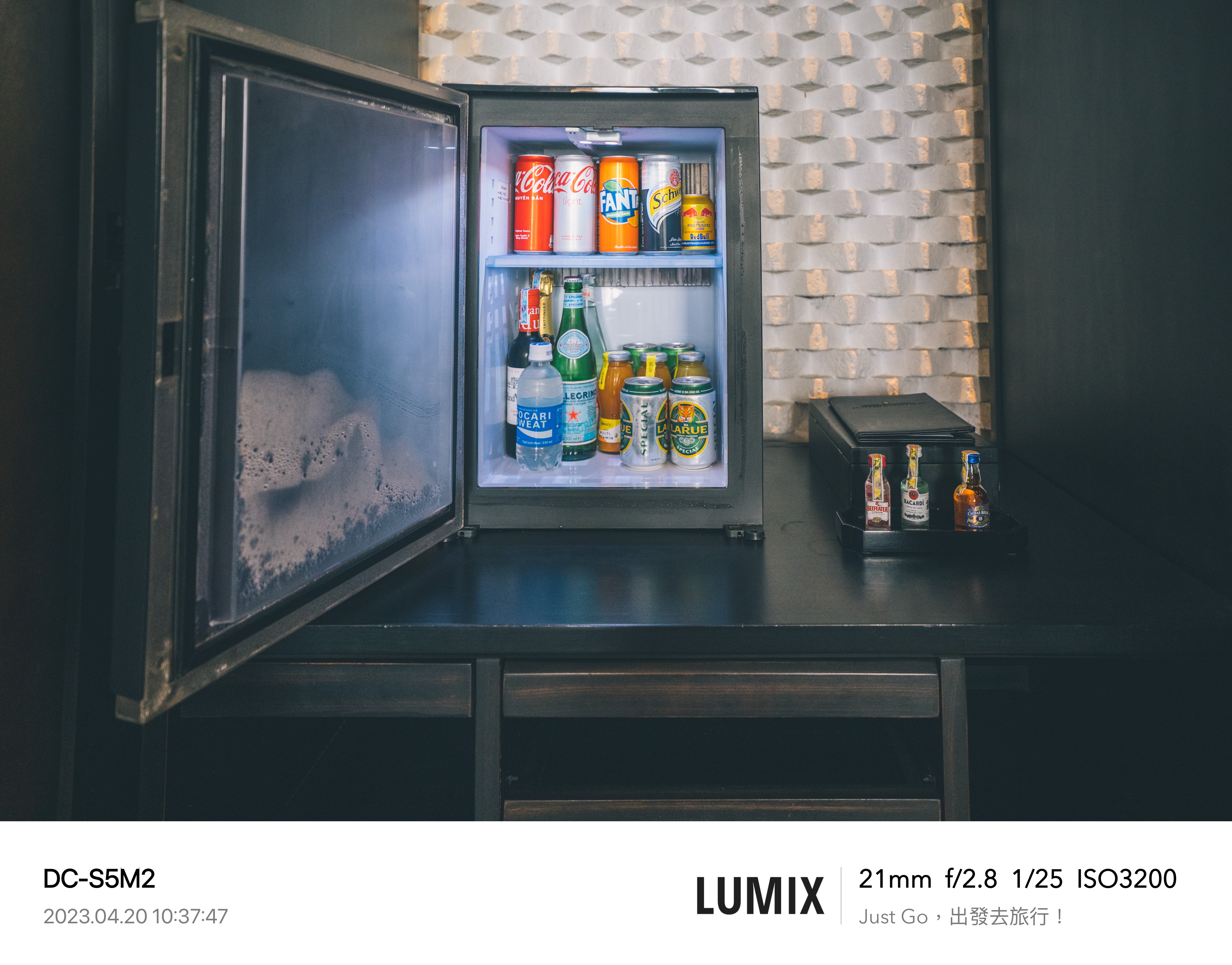 房內還設有四個大型的櫥櫃,位於房間後側的兩個大櫥櫃分別為冰箱和付費Mini Bar以及熱水壺和免費的茶包、咖啡包。